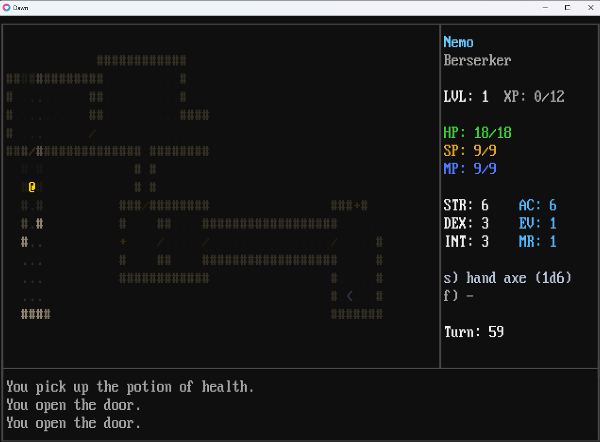 Dawn is a roguelike made in Lua + LÖVE. This is my very first game developed end-to-end. It was developed from scratch without any previous code. The objective was to build somewhat of a modernized Angband/DCSS hybrid (auto explore, auto fight). The RPG system is the weakest part of the design, since I ran out of time to finish it. I do plan on improving it to be more well rounded, add abilities and spells to make the classes stand out.